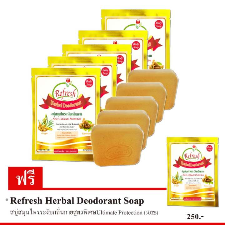 🛍 คุณกำลังค้นหา Refresh Herbal Deodorant Soap - สบู่สมุนไพรระงับกลิ่นกายรีเฟรช 5ชิ้น(90g.) + ฟรี! 1 ชิ้น